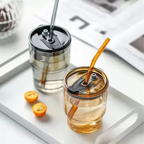 Glass Tumbler with Straw and Lid Glass Cup with Leather Sleeve