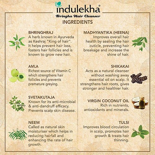 - Indulekha Bringha Hair Cleanser is an all-natural ayurvedic hair cleaner for men and women. It is enriched with the benefits of bhringraj, which are known for their medicinal properties of reviving and regenerating new hair and it includes other natural powerful herbs. Moreover, the ayurvedic ingredients provide nourishment, fresh fragrance and overall healthy hair