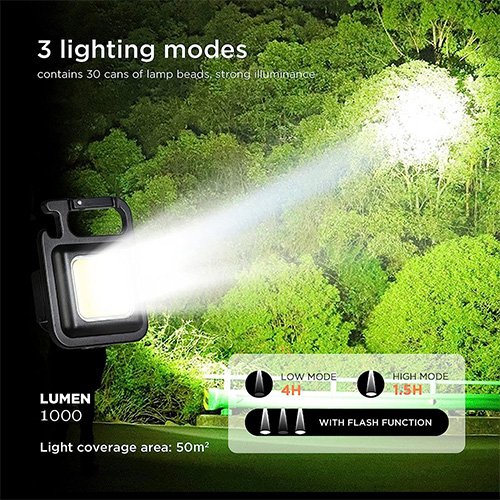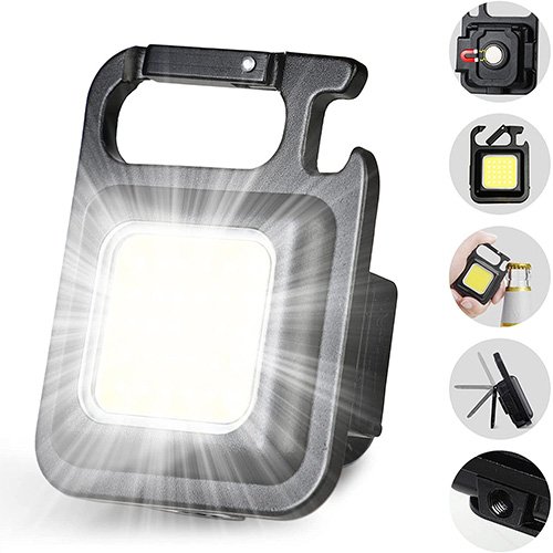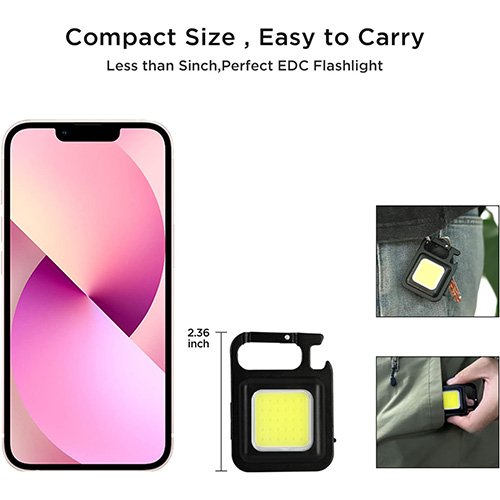 - MULTI-FUNCTIONAL PORTABLE DESIGN: The small keychain flashlight have 3 Lighting Modes, with SOS function, and square design. The lep flashlight top is a climbing buckle design can be hung in any position you want to, and with a bottle opener function to help you open a variety of metal lids in the field, the back is 180 ° rotatable bracket, the COB light put on the ground can also be used steadily.