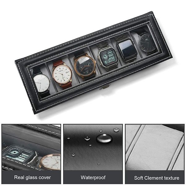- Material Characteristics: The watch storage organizer box is made of high grade black faux leather and glass top gives a clear view when the box is closed. Box measures 30x11x8cm and it has a metal clip lock.