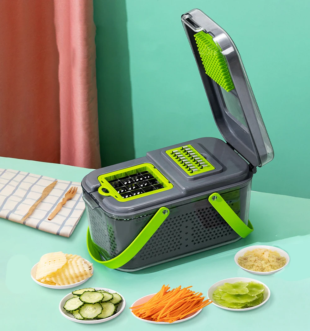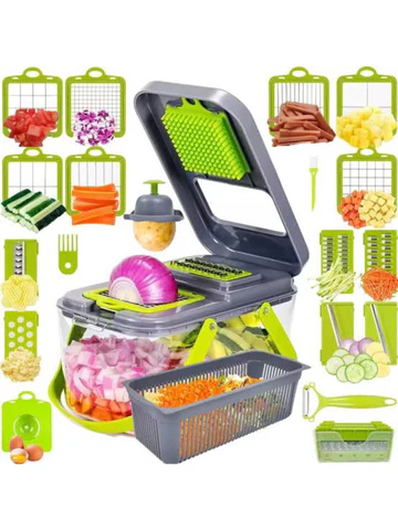 - 22-in-1 multifunction vegetable chopper with 14 interchangeable blades for slicing, dicing, chopping, and shredding